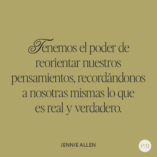 Si no nos gusta a dónde vamos, tenemos el poder de reorientar nuestros pensamientos, recordándonos a nosotras mismas lo que es real y verdadero, como una madre lo haría con su hijo o hija cuando está a punto de perder la paciencia: «Hijo, toma una pausa. Te amo. Estás bien. No tienes por qué entrar en pánico. Puedes escoger otro camino. No tienes por qué desesperarte por todo esto».
