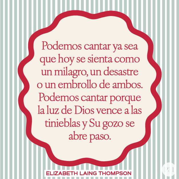 Gracias a ese día, podemos estar con los pastores y cantar con los ángeles. Podemos cantar ya sea que hoy se sienta como un milagro, un desastre o un embrollo de ambos. Podemos cantar porque la luz de Dios vence a las tinieblas y Su gozo se abre paso.
