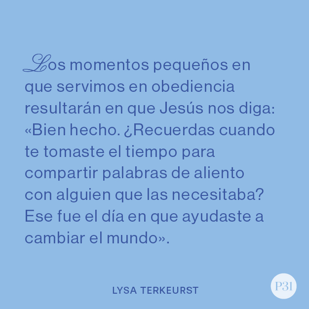 Cuando lleguemos al cielo, creo que nos sorprenderá lo que realmente fue importante. Lo que realmente cambió el mundo. Lo que realmente cumplió el propósito para el que fuimos creados. Y los momentos pequeños en que servimos en obediencia resultarán en que Jesús nos diga: «Bien hecho. ¿Recuerdas cuando te tomaste el tiempo para compartir palabras de aliento con alguien que las necesitaba? Ese fue el día en que ayudaste a cambiar el mundo».