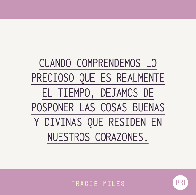 Cuando comprendemos lo precioso que es realmente el tiempo, dejamos de posponer las cosas buenas y divinas que se mueven en nuestros corazones. Las cosas que nos traen gozo. Dejamos de esperar que la vida se calme o se alinee perfectamente. Damos un paso adelante, confiando en que Dios nos dio ese deseo por una razón y que Él tiene un plan.