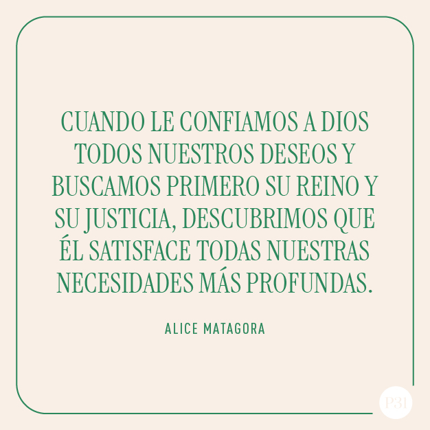 Porque servimos a un Dios que es nuestro Padre amoroso, ya no tenemos que valernos por nosotras mismas, viviendo como si nuestras vidas dependieran enteramente de nuestros esfuerzos. Cuando le confiamos a Dios todos nuestros deseos y buscamos primero Su Reino y Su justicia, descubrimos que Él satisface todas nuestras necesidades más profundas. Podemos vivir despreocupadas bajo el cuidado de Dios.