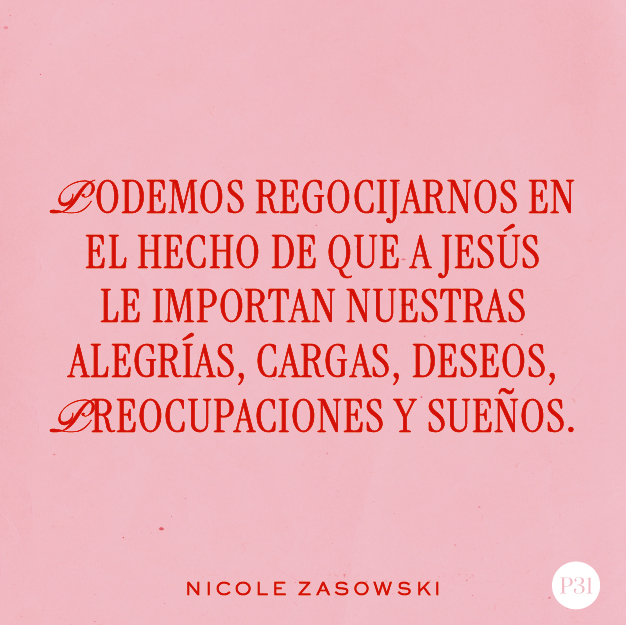 Si bien nuestra satisfacción será más saciada cuando Jesús, nuestro gozo mayor, está en el centro de nuestros afectos, también podemos regocijarnos en el hecho de que a Jesús le importan nuestras alegrías, cargas, deseos, preocupaciones, y sueños. Éstos deben estar correctamente ordenados, pero son de profunda importancia para Él.
