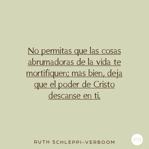 ¿Cuál es tu debilidad en este momento? ¿Cuál es tu dolor? ¿Qué te abruma? Lleva todo eso a Jesús. No permitas que las cosas abrumadoras de la vida te mortifiquen; más bien, deja que el poder de Cristo descanse en ti. Él te mostrará la debilidad en tus debilidades.