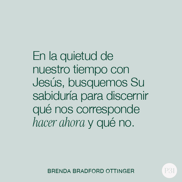 Que podamos aquietar nuestras expectativas, respetar nuestras limitaciones, optando con discernimiento y en oración por renunciar a aquellas oportunidades que agotan nuestra capacidad de cumplir la misión de Dios en nuestras vidas. Y en la quietud de nuestro tiempo con Jesús, busquemos Su sabiduría para discernir qué nos corresponde hacer ahora y qué no.