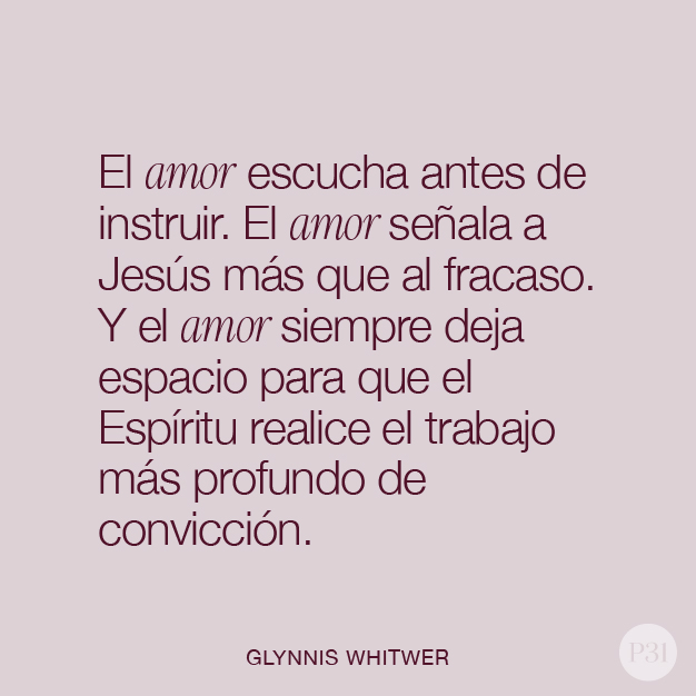 Todavía puede haber momentos en que Dios me impulse a decir la verdad o a establecer límites. Pero incluso entonces, el amor es la cobertura. El amor escucha antes de instruir. El amor señala a Jesús más que al fracaso. Y el amor siempre deja espacio para que el Espíritu realice el trabajo más profundo de convicción.