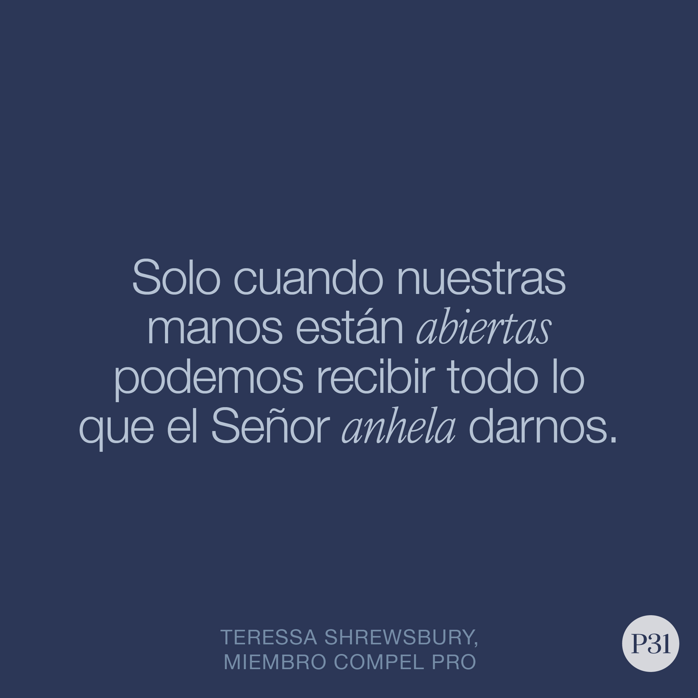 Incluso en los momentos en que creemos saber qué es lo mejor. Cuando nos sentimos abrumadas. Cuando el siguiente paso no está claro. Con las manos abiertas, podemos llevarlo todo a nuestro Padre amoroso y ponerlo en Sus manos. Porque solo cuando nuestras manos están abiertas podemos recibir todo lo que el Señor anhela darnos.