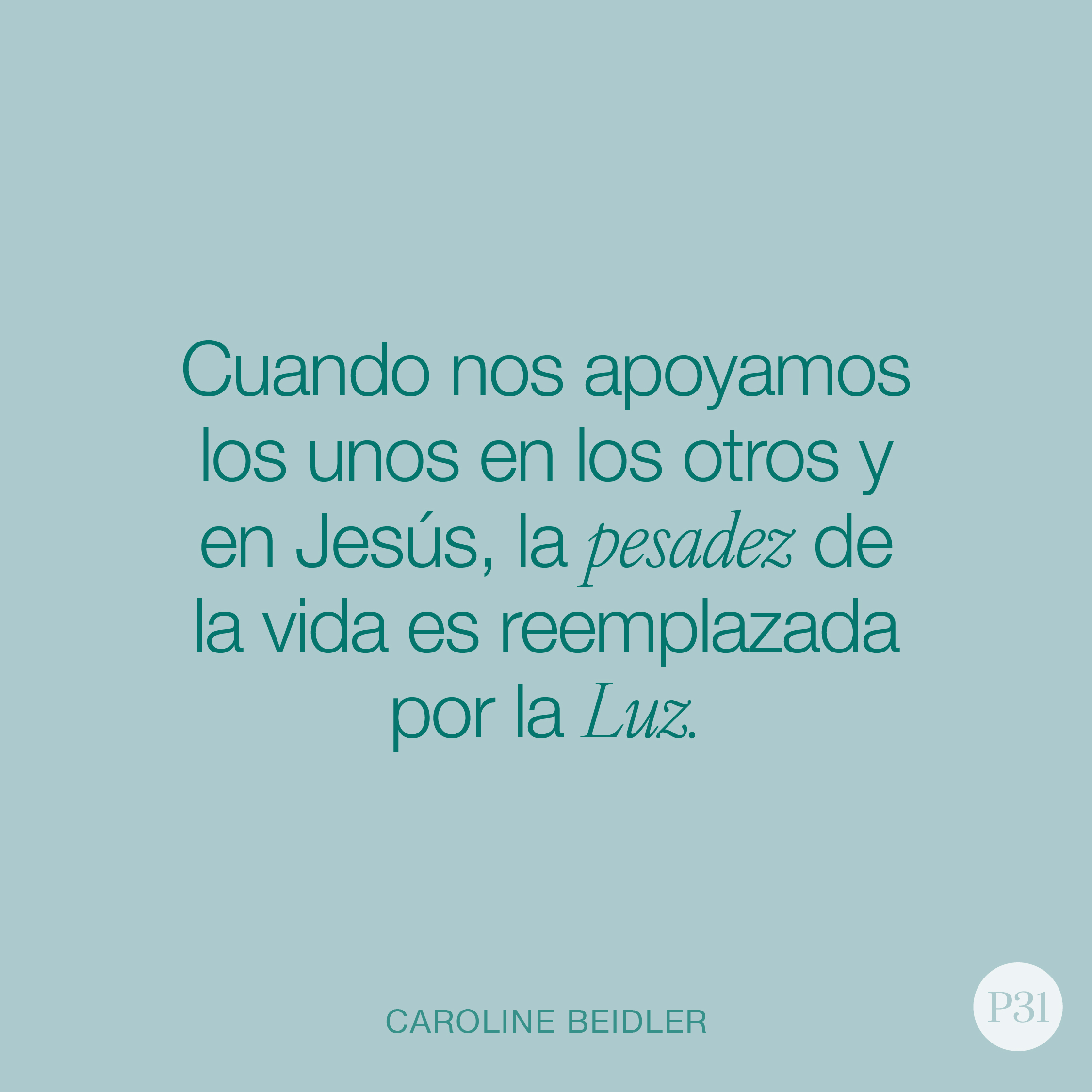 Pero Dios ofrece un camino más ligero. En Gálatas 6:2, la Palabra de Dios, por medio del apóstol Pablo, nos recuerda que somos llamadas a estar ahí las unas para las otras. “Ayúdense unos a otros a llevar sus cargas y así cumplirán la ley de Cristo”. Nunca estuvimos destinadas a vivir la vida ni a enfrentar las pruebas en soledad.