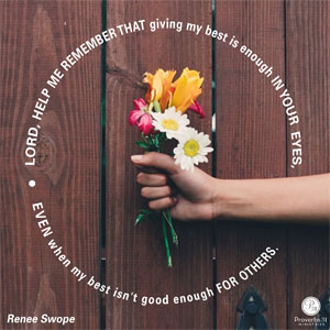 Lord, some days my best isn't good enough, but it's all I have to give. Help me remember that my best is all You expect. Guide me with Your grace as I make truth-filled assessments of my life and wisdom-based adjustments as needed. In Jesus' Name, Amen.