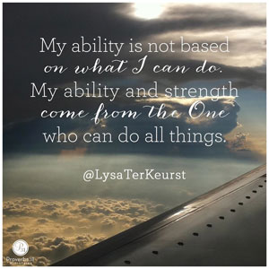 As 2 Corinthians 12:9 teaches, God's power is made perfect in weakness. When I'm sinking in thoughts of inadequacy, I remember that my ability is not based on what I can do. My ability and strength come from the One who can do all things.