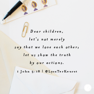 "Dear children, let's not merely say that we love each other; let us show the truth by our actions." 1 John 3:18 (NLT)