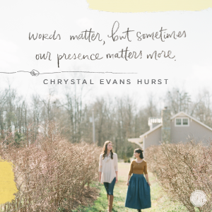Even counselors know sometimes the best thing to do is simply sit and listen. You don’t always have to have the right word to say or know the perfect thing to do. When words don’t work, your presence alone can be both a personable and poignant way to show a hurting friend you care.
