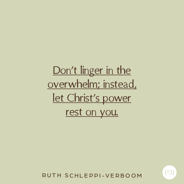 What’s your weakness at this moment? What’s your pain? What overwhelms you? Bring it all to Jesus. Don’t linger in the overwhelm; instead, let Christ’s power rest on you. He will show you the weakness in your weaknesses.