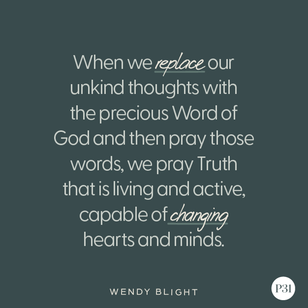 When we replace our unkind thoughts with the precious Word of God — and then pray those words — we pray Truth that is living and active, capable of changing hearts and minds. We pray the mind and will of God, as revealed in His Word, into our marriages!