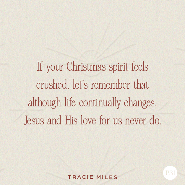 Whatever the reason, if your Christmas spirit feels crushed, let’s remember that although life continually changes, Jesus and His love for us never do. Refocusing on the hope and joy available to us because of His holy birth can restore the most broken spirit.