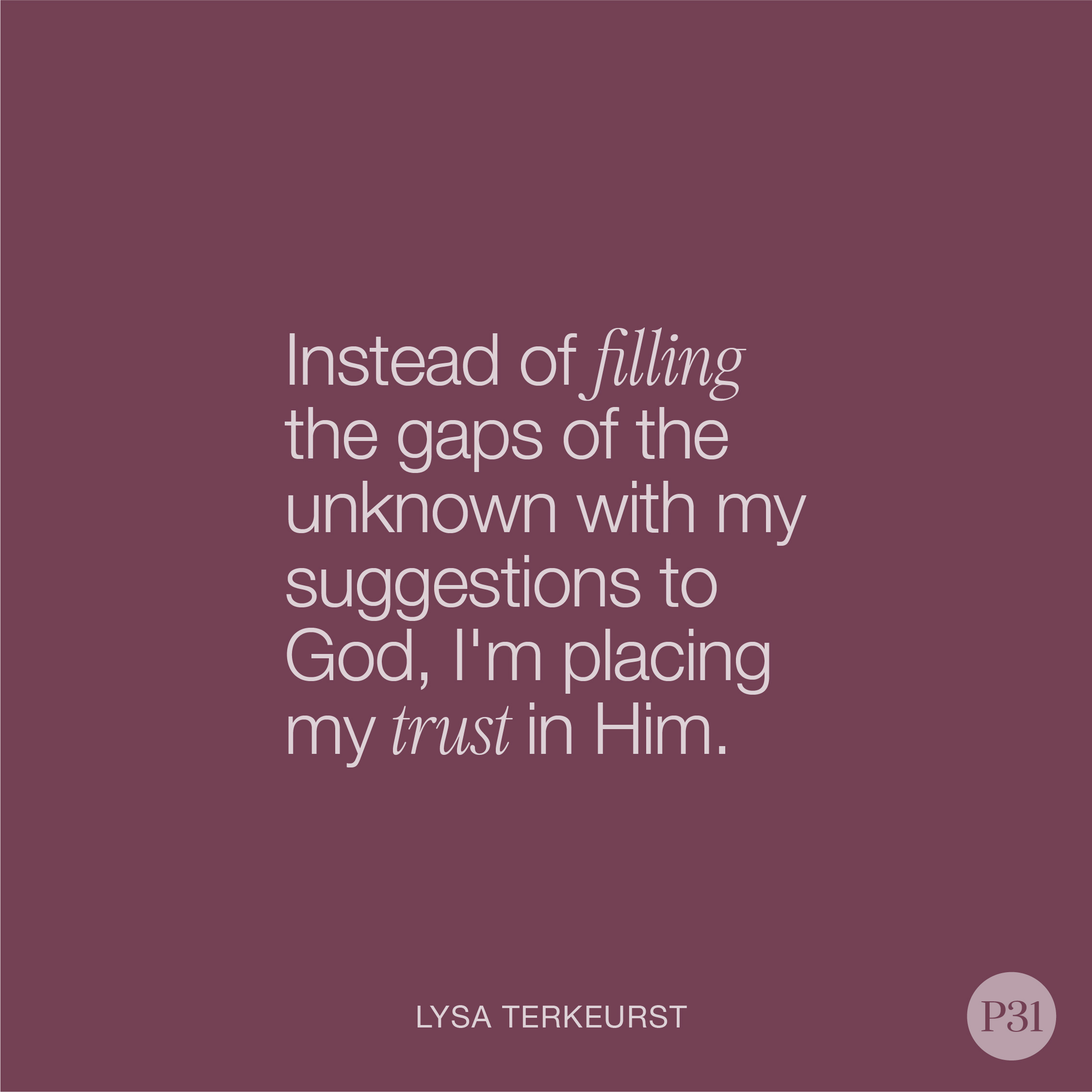 Often my confusion isn’t because God is being mysterious; it’s because I’m not being obedient. As I enter this brand-new day, I’m seeking Him rather than trying to figure out His plan. Instead of filling the gaps of the unknown with my suggestions to God, I’m placing my trust in Him.